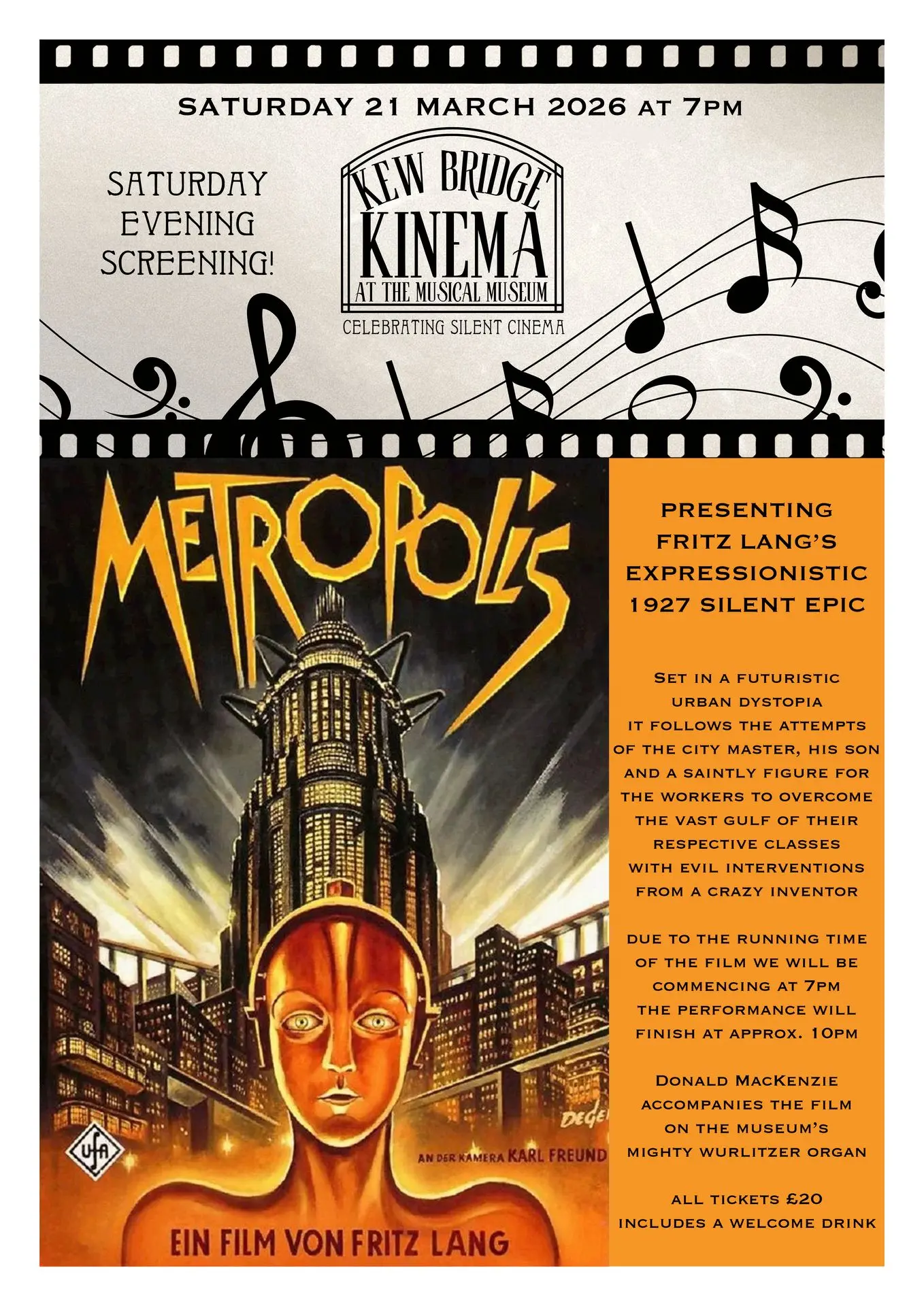 Join us at the Kew Bridge Kinema at The Musical Museum for a special screening of one of the most influential films in cinema history: Fritz Lang’s 1927 expressionistic silent epic, Metropolis.